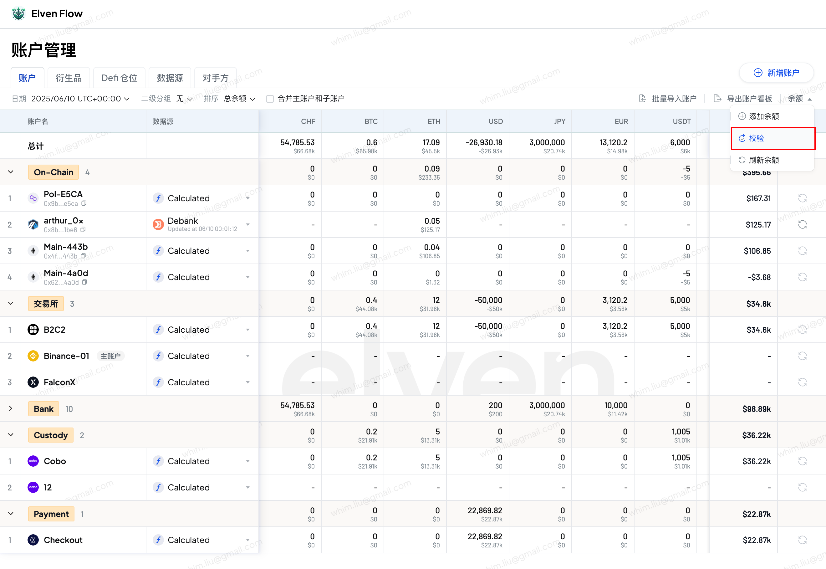 2. 在账户列表，点击右侧“余额”按钮，在下拉菜单选择“校验”即可打开余额校验任务列表。