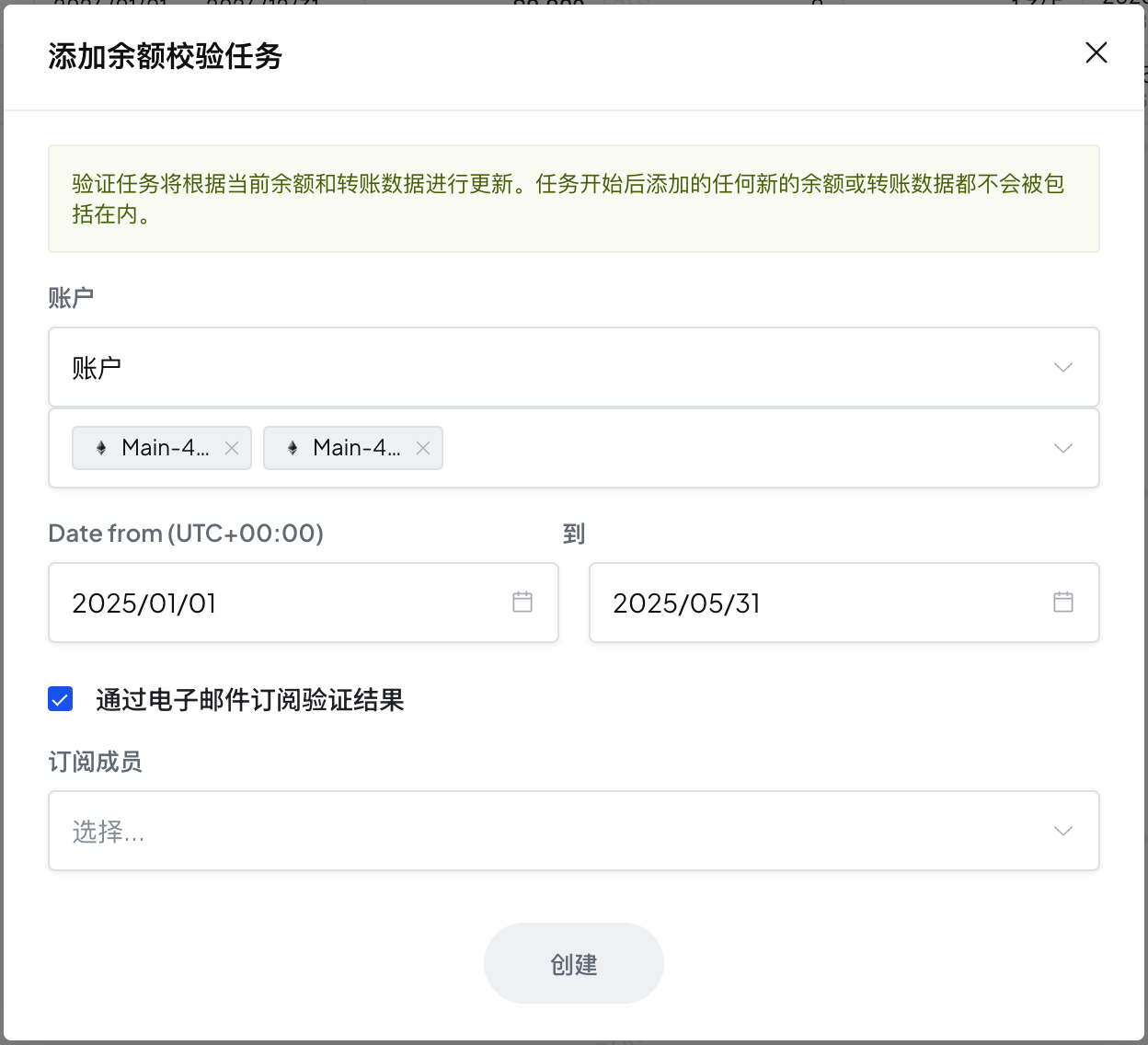 该模块支持用户指定账户和时间区间创建校验任务，系统将自动根据账户和币种颗粒度生成校验子任务，并支持在任务完成后通过邮件通知校验结果。