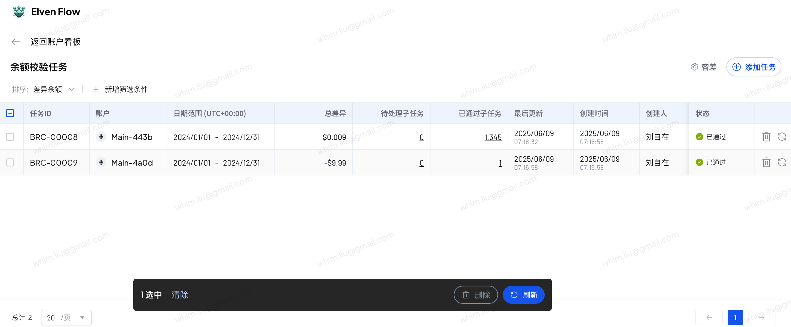 4. 确认创建后，每个账户会分别创建一个指定的时间区间的校验任务，并自动开始校验。