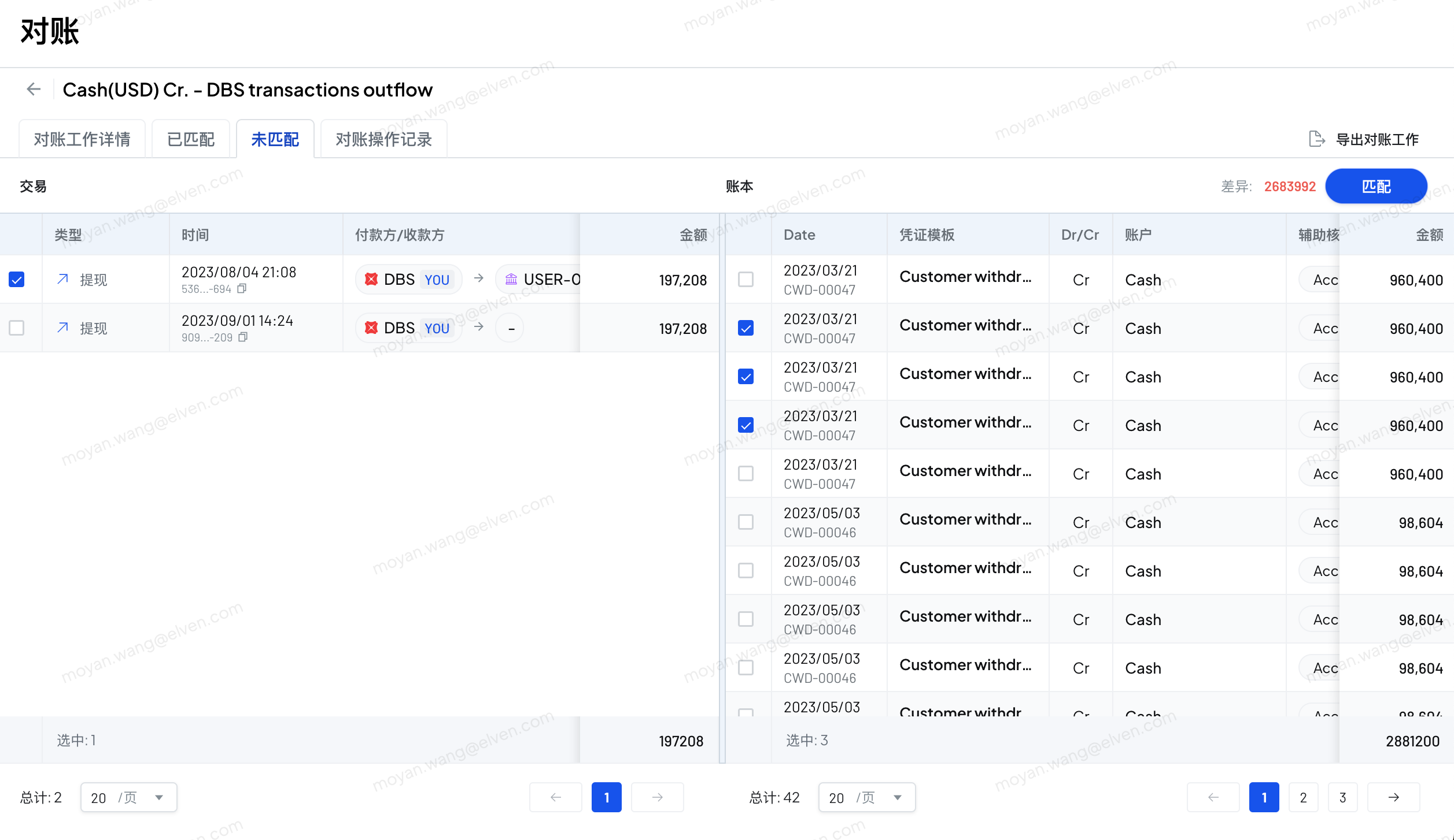 2. 在左侧面板选择需要手动匹配的交易数据、右侧面板选择需要匹配的账本数据。