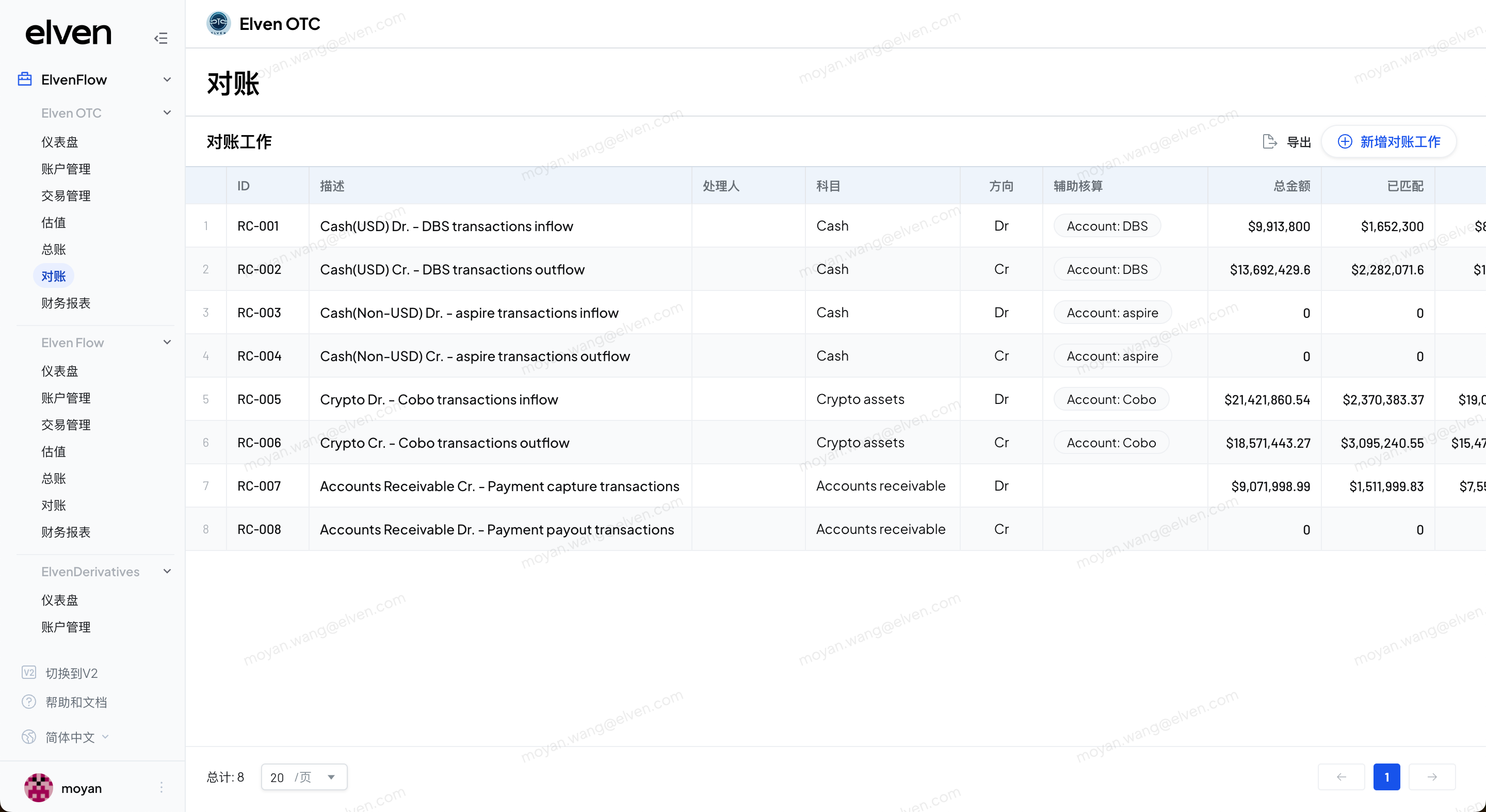 2. 支持按照金额、时间、id、账户等匹配对账双方数据。