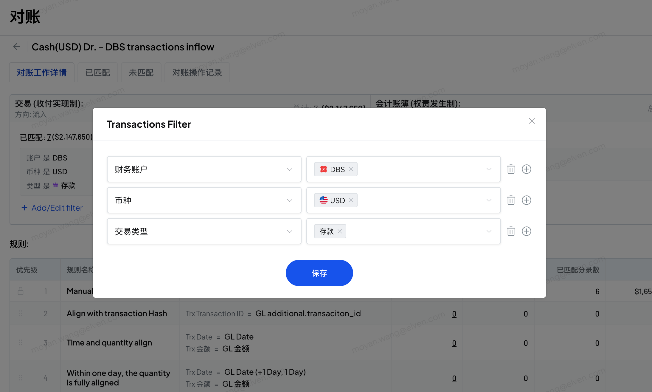 1. 在对账工作详情页，点击“新增规则”按钮，配置自动化对账规则。